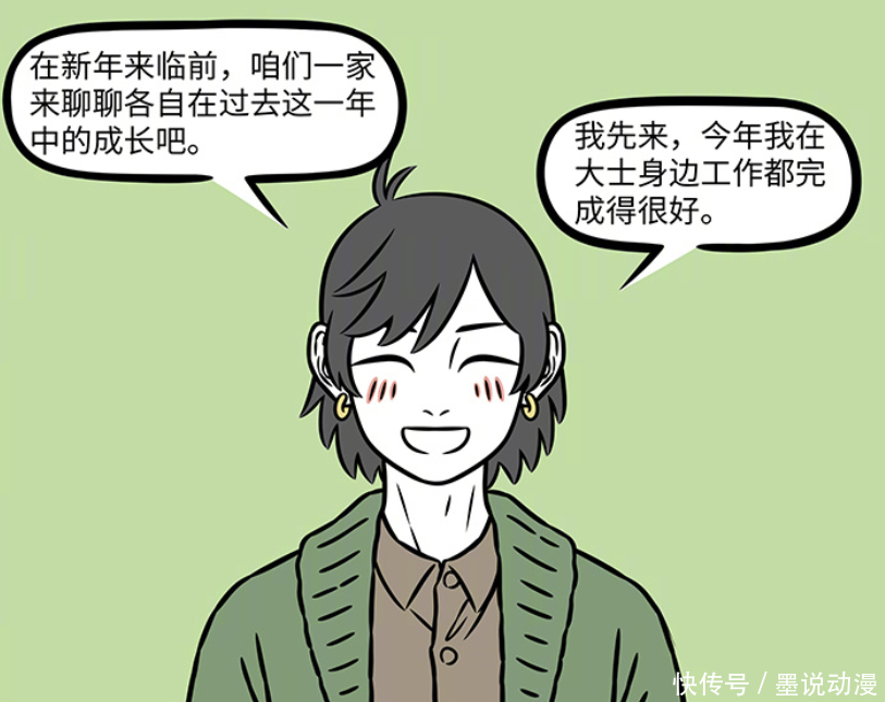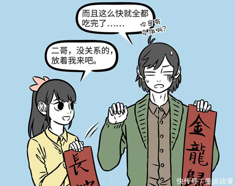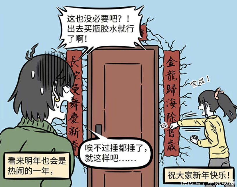 《非东说念主哉》第1086话更新,这一话是金吒、木吒、哪吒和李贞英兄妹四东说念主聚在沿路,主淌若陈述本年的成长。木吒完成了不雅音的通盘任务,哪吒阻拦李靖长头发。金吒幸免我方秃子,李贞英轻易学校设备。临了木吒熬了浆糊,念念要按照传统花式贴对子,恶果浆糊被哪吒吃完,李贞英用怪力贴好对子。
