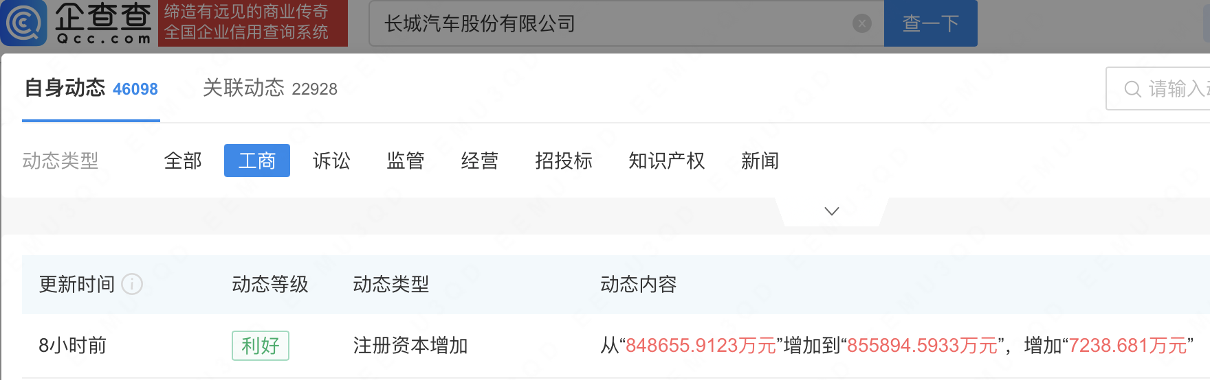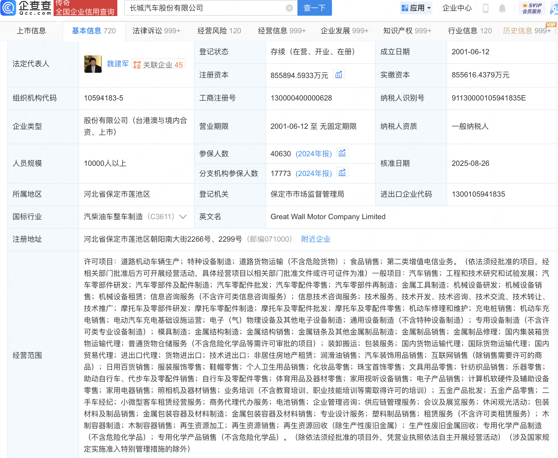 近日,长城汽车(601633)发生工商变更,注册成本由约84.87亿元增至约85.59亿元。企查查信息浮现,长城汽车栽种于2001年,法定代表东谈主为魏建军。